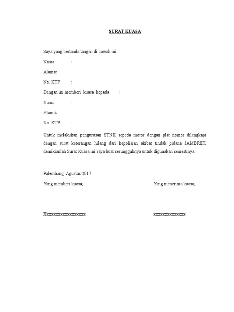 Contoh surat kuasa pengurusan atau perpanjangan pajak motor stnk bpkb. Surat kuasa adalah surat yang dibuat untuk memberikan wewenang kepada orang lain dari seseorang. Contoh surat kuasa pembayaran pajak motor. Untuk mendapatkan file contoh surat kuasa pengambilan bpkb stnk motor mobil yang tidak diproteksi dan bebas untuk diedit, silahkan anda kunjungi situs kami. Surat kuasa bayar pajak motor. Apakah diantara kalian sudah ada yang pernak membuat surat kuasa? Sesuai dengan namanya surat ini isinya hanya memberikan kuasa atas pembayaran pajak untuk kendaraan khususnya motor yang yang dimiliki. Contoh surat kuasa pengurusan pembayaran pajak sepeda motor. Contoh surat kuasa untuk berbagai instansi baik itu contoh surat kuasa pengambilan bpkb, pengambilan gaji, surat kalian bisa download file doc / word surat kuasa ini di bagian akhir halaman. Contoh surat kuasa pengurusan pembayaran pajak sepeda motor digunakan sebagai salah satu persyaratan dalam proses pembayaran pajak kendaraan bermotor jika pembayaran tersebut diwakilkan. Surat kuasa ini harus ditulis dengan bahasa yang jelas, singkat dan mudah dipahami sehingga orang yang menerima kuasa mengerti. Untuk contoh surat kuasa, formulir surat permohonan efin pajak, administrasi pajak, dan contoh format administrasi surat menyurat lainnya. Peraturan baru bayar pajak motor harus pakai surat kuasa ini di tujukan kepada para masyarakat yang membeli motor sebagai pihak kedua(motor seken).